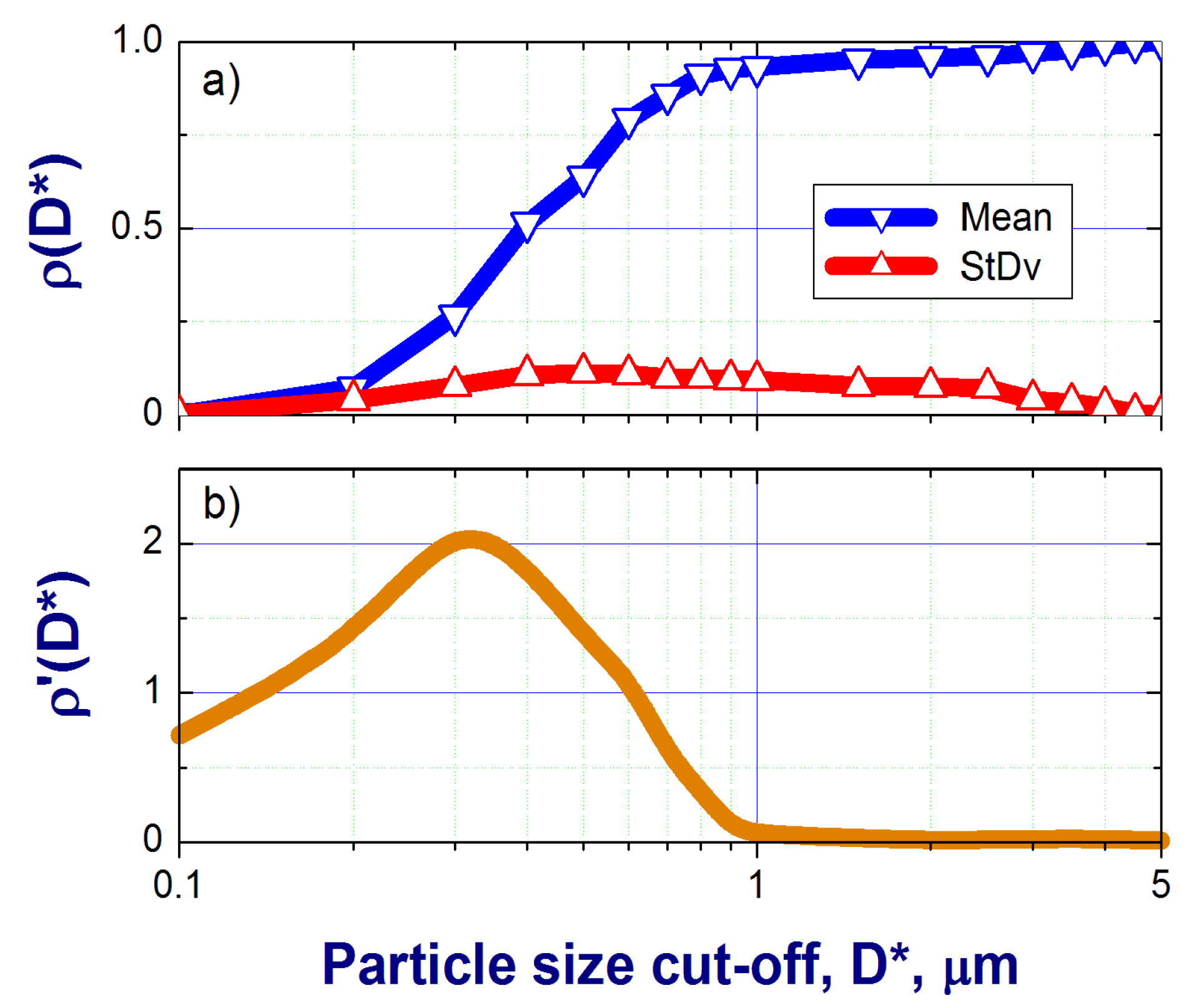 The normalized scattering coefficient (a) and its derivative (b) as a function of particle size cut-off. The blue line shows the mean for all TCAP flight legs and the red line represents the corresponding standard deviations.