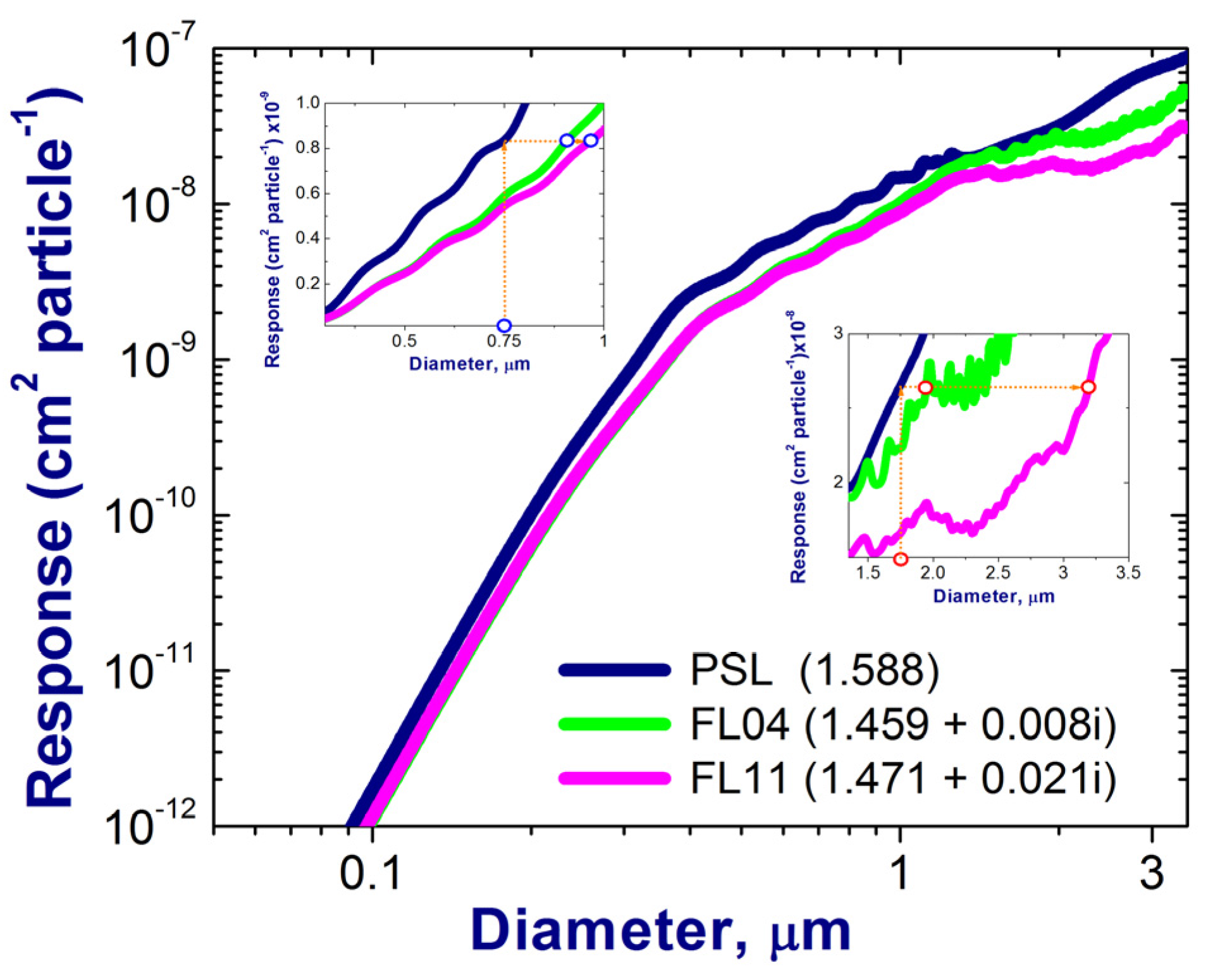 Example of theoretical response curves as a function of dry diameter (Ddry) calculated for spherical particles and different values of complex RI. These values represent polystyrene latex spheres (PSL; navy blue) and those calculated for two FLs (FL = 4, green; FL = 11, magenta; 21 July 2012) from chemical composition measurements under dry conditions. Two complementary zoom-in versions of the calculated response curves are also included to illustrate that these curves may exhibit “smooth” and “bumpy” behavior for different ranges of diameter (see text for details).