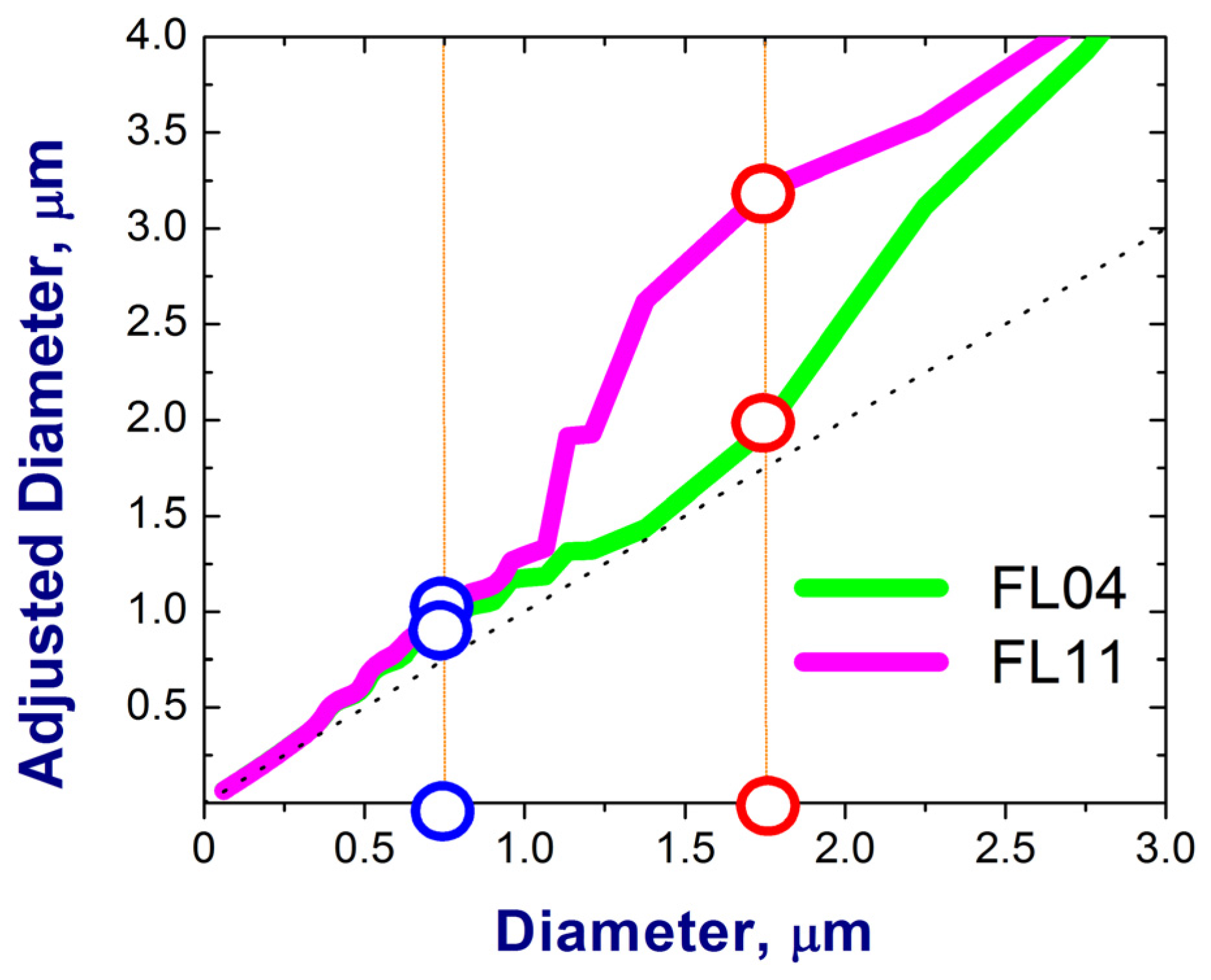 Adjusted dry diameter (Ddry,adj) as a function of original dry diameter (Ddry) obtained for two FLs (FL = 4, green; FL = 11, magenta; 21 July 2012) from the calculated response curves (Figure C1).