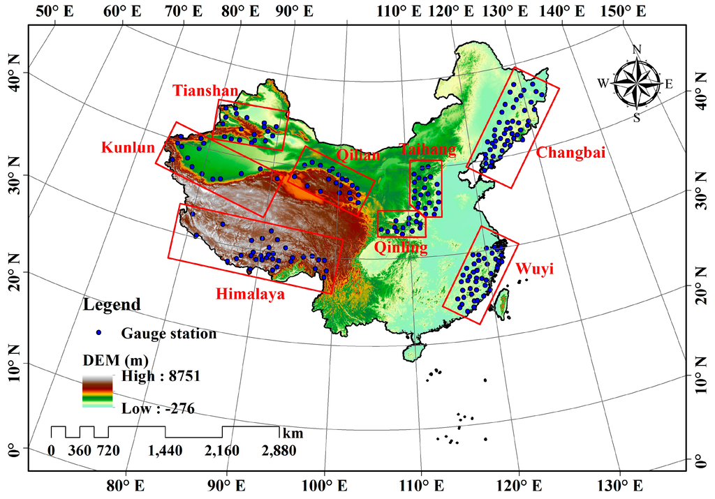 The location of the studied mountainous areas of China. The red lines are the boundaries of the mountainous areas, and the blue dots are the gauge stations.