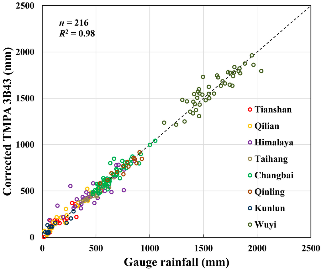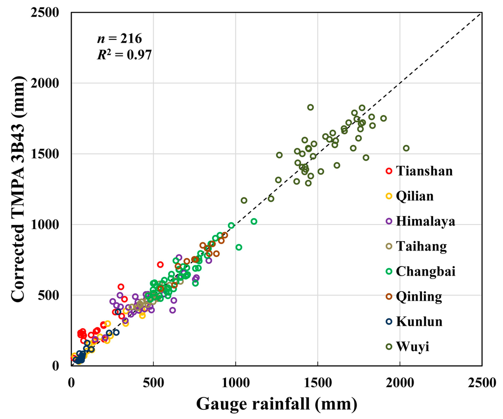 Current studies of evaluation and correction of satellite precipitation products mainly focus on grid cells with gauge measurements. Few studies examine grid cells without gauges even though a majority of grid cells do not have gauge measurements because of the sparse gauge network, especially in mountainous areas. In practice, the post-real-time satellite rainfall products (such as TMPA 3B43) incorporated global gauge network data to remove bias, so that the grid cells with gauges may have a higher accuracy, whereas grid cells without gauges have not been bias-corrected but are considered to have the same level of accuracy as those grids with gauges. There is a large uncertainty and over-optimistic.