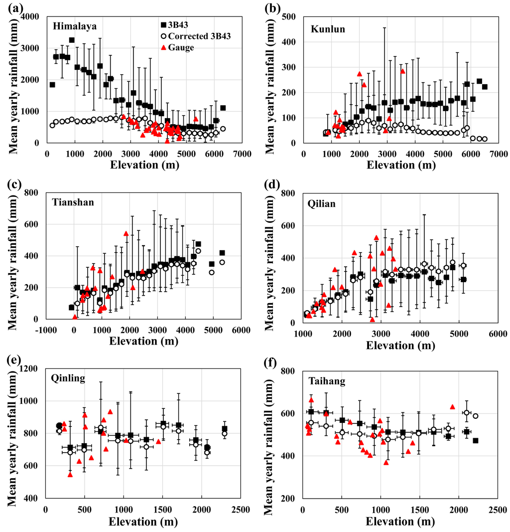 It shows that the 3B43 products tended to overestimate rainfall by 15.8% on mean annual scale. In the higher mountains with peaks above 5800 m, including Himalaya, Kunlun, Tianshan and Qilian, the mean overestimation bias is 24.5% in the altitude from 35 m to 4900 m on gauged grid cells. In the other mountains with peaks lower than 3800 m, including Qinling, Taihang, Changbai and Wuyi, the mean overestimation bias is only 7.0% in the altitude from 3 m to 2208 m on gauged grid cells.