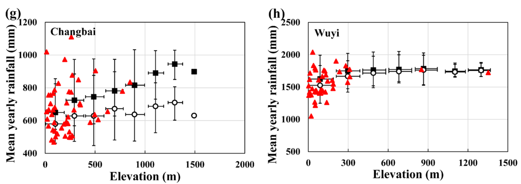 The Himalaya, Kunlun and Qilian are located in the Qinghai–Tibetan High Plateau. The Himalaya tops at 8848 m and blocks the wet monsoon winds from south, drier and colder winds from the north [22]. Kunlun tops at 7576 m controlled by the Westerlies in summer and Mongolian–Siberian High in winter with a cold and arid climate [35]. Qilian has the peak of 5820 m and the climate varies from arid to semiarid with large temporal–spatial precipitation difference [36]. Tianshan is also located in the west of China and is kept away from the moisture, resulting in an arid continental climate [37]. Taihang and Qinling are located in the central part of mainland of China with the peak of 3059 m and 3747 m respectively. The Taihang serves as an important geographical boundary with the Loess Plateau to its west and the North Plain to its east [38]. The Qinling acts as a significant climate boundary in China, blocking cold, dry airflow from the north in winter and humid, warm airflow from the south in summer [39]. Influenced by the East Asian summer monsoon, Taihang and Qinling have the typical continental monsoon climate with wet summers and dry winters. Changbai and Wuyi are located in northeast and southeast of China, respectively, with relatively low altitude. The Changbai stretches along the boundary between China and North Korea and has a temperate continental climate with long cold winter and short summer [40]. Located in southeast China near the sea, the Wuyi has a warm, humid subtropical climate characterized as monsoon patterns. The hot season (April to September) has the greatest precipitation brought by summer monsoon and typhoons [41].