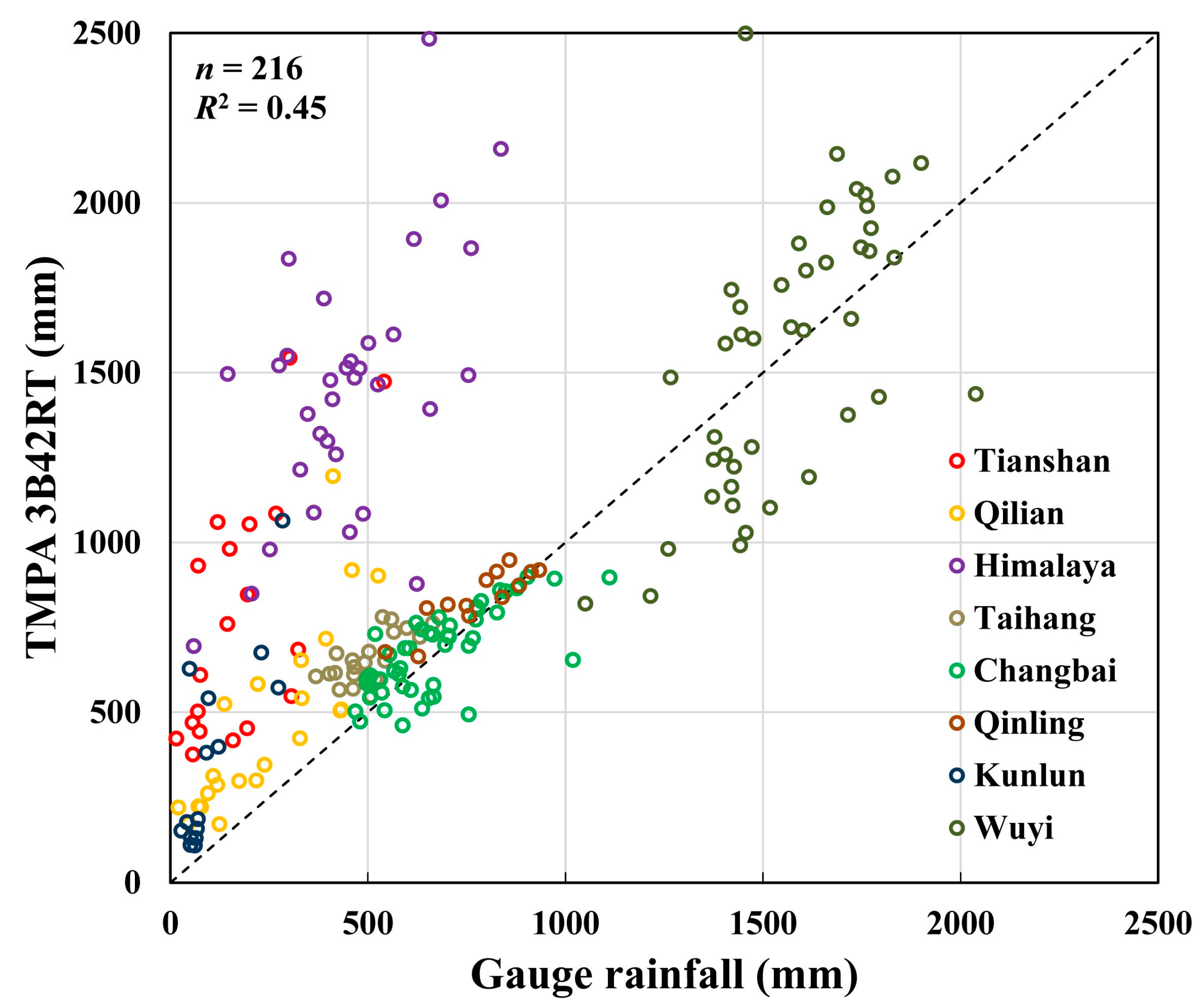 - Ji, X.; Luo, Y. Quality Assessment of the TRMM Precipitation Data in Mid Tianshan Mountains. Arid Land Geogr. 2013, 36, 253–262. [Google Scholar]