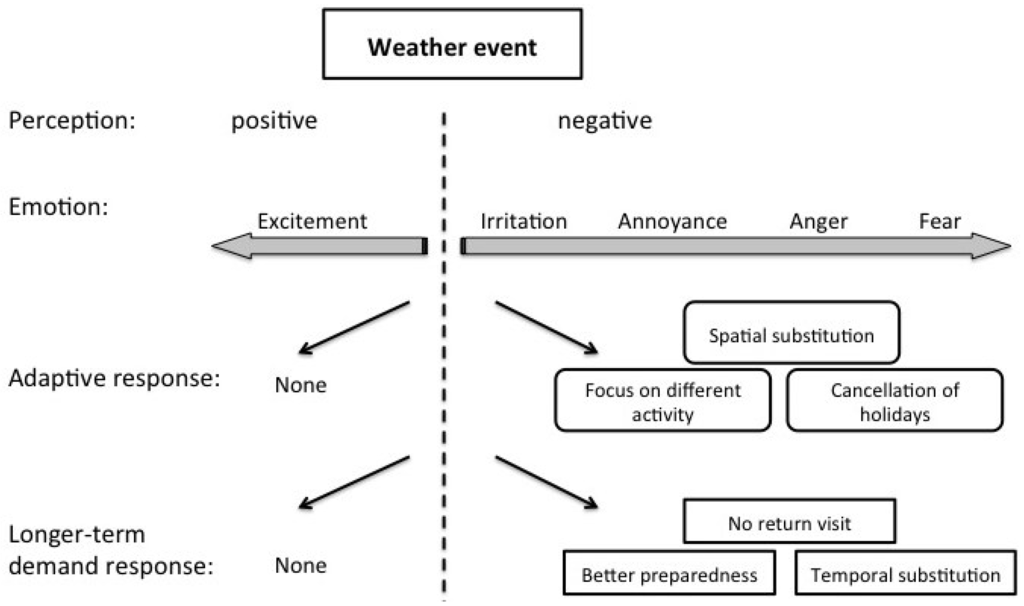 This study investigated long-term perceptions of negative holiday experiences based on qualitative interviews with Austrian, German and Swiss residents, concluding that weather and environmental events are not currently dominating long-term perceptions, and that not all of these negatively experienced events would be considered “extreme” in a meteorological sense. However, such events are of considerable importance in affecting memories, and likely to become more relevant in the future, when climate change progresses. In the context of tourist demand responses, two relevant new findings have emerged from this study: first, there exists a wide range of weather events that can influence holiday perceptions, though rain is the single most relevant aspect generating negative experiences. Findings also suggest, more generally, that physical facets of weather events appear to be more relevant in perceptions than thermal or aesthetic ones. Second, experiences of weather events perceived as “extreme” are related to emotions, which can be positive, but are more likely to be negative, including feelings of irritation, annoyance, anger, and fear. The emotional intensity of experiences may be of relevance in immediate (cancellation before holiday, spatial substitution, or quitting of holidays) and longer-term demand responses (higher degree of preparedness, temporal substitution, spatial substitution, no return visits), though no clear relationships were found in this research.