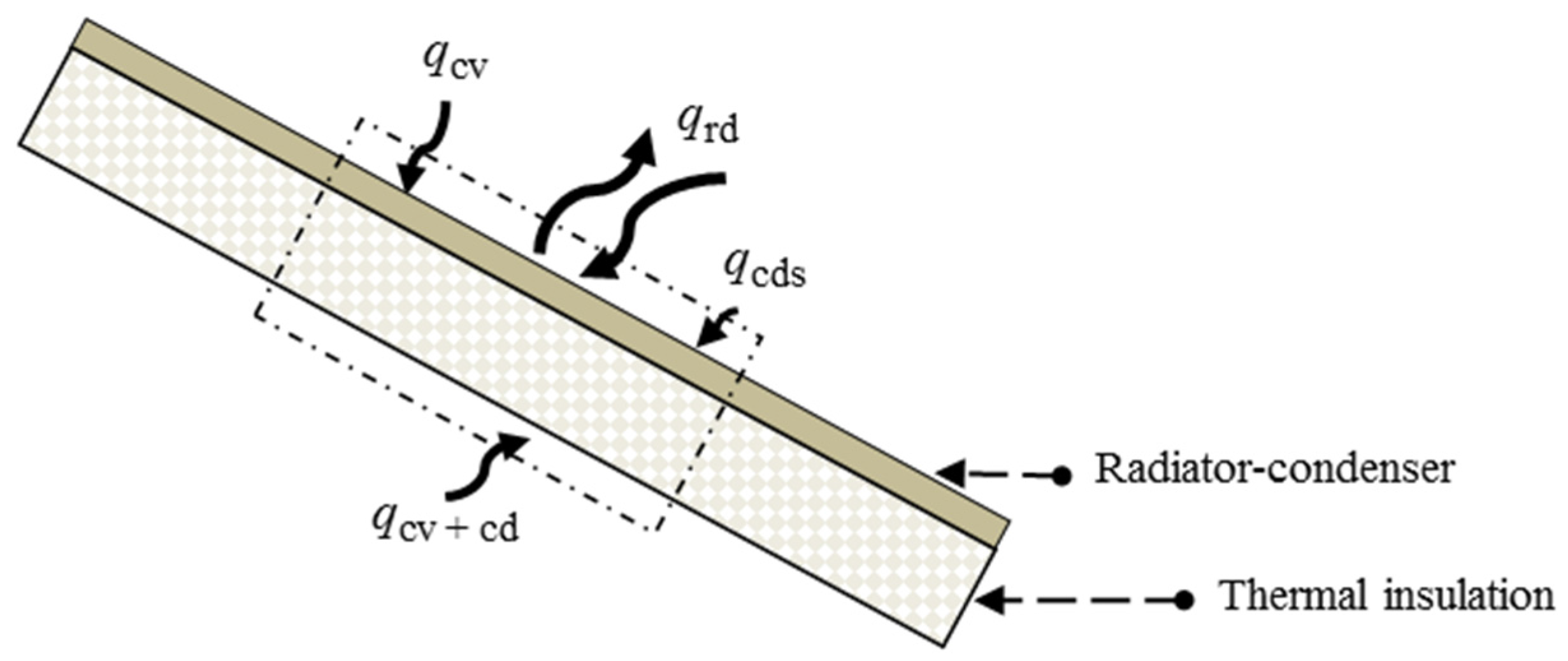 The outgoing heat flux is due to the net radiative heat exchange qrd, between the sky and the RC. The incoming heat fluxes are due to the convective heat exchange qcv between the ambient air and the RC, the convective-conductive qcv+cv heat exchange between the ambient air and the RC thermal insulation, and the latent heat of condensation qcds on the RC (Figure 1). Equation (1) is the steady state energy balance on the RC [3,4,23] and it gives the rate of dew condensation ṁ.