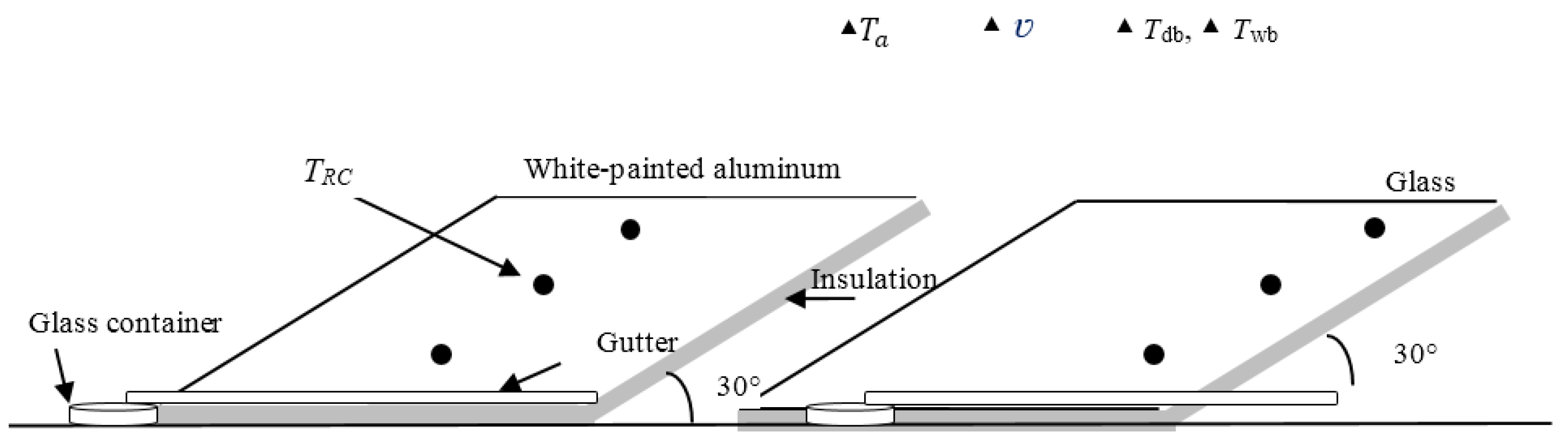 Figure 2 and Figure 3 show the experimental setup. The two collectors were inclined 30° to the horizontal, facing North, according weather conditions of Section 2.1. The RC view factor was 0.7. The inclination allows the sliding of the condensed dew toward the bottom of the RC, then to a gutter, and finally to a glass container; both dew collectors operated at the same time for comparison. The TRC was measured at three points, and then averaged. The ambient temperature, wind velocity, and dry and wet bulb temperatures were measured by sensors that were placed above the dew collectors.