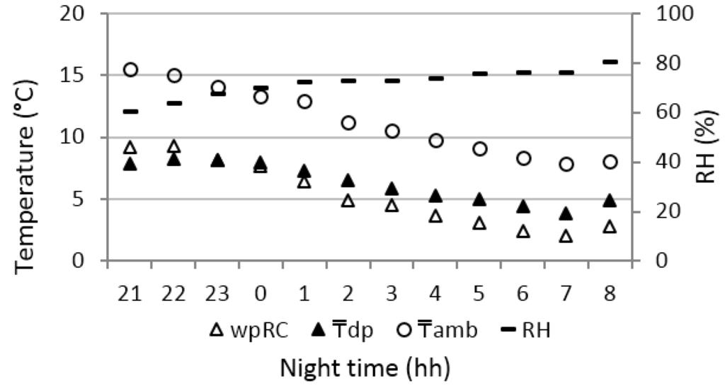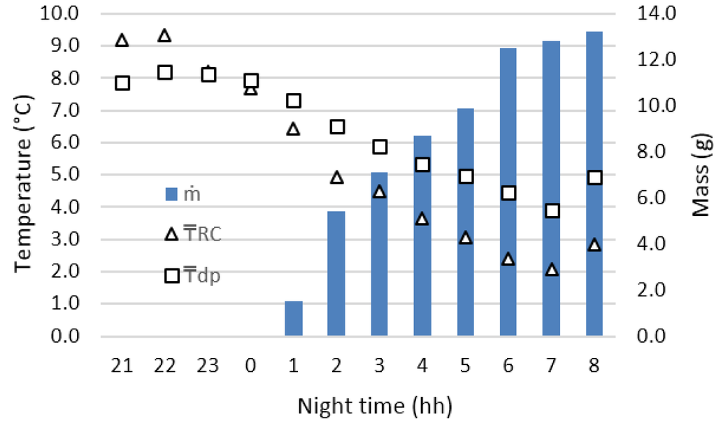 Figure 4 shows the hourly dew harvest and the weather conditions during the representative night. As observed, at the beginning of the experiment, at 21:00 p.m., RH was 60% and Ta was 16.0 °C, with TRC higher than Tdp, conditions that did not produce condensation. After 23:00 p.m., TRC was below the Tdp and the relative humidity increased to reach 80%, which caused condensation on the RC that lasted until 8:00 a.m. The hours considered in these graphs correspond to local time.