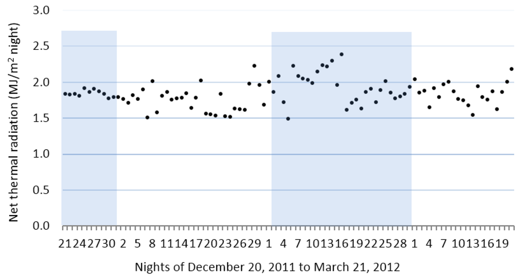 During the experiments, the net thermal radiation was 1.9 MJ/m2 night, on average, according to the first term of Equation (3). It was roughly constant during the winter, with fluctuations of 20%, as shown in Figure 6. The causes of the net thermal radiation fluctuations are mainly attributable to variations in the cloudiness and relative humidity.