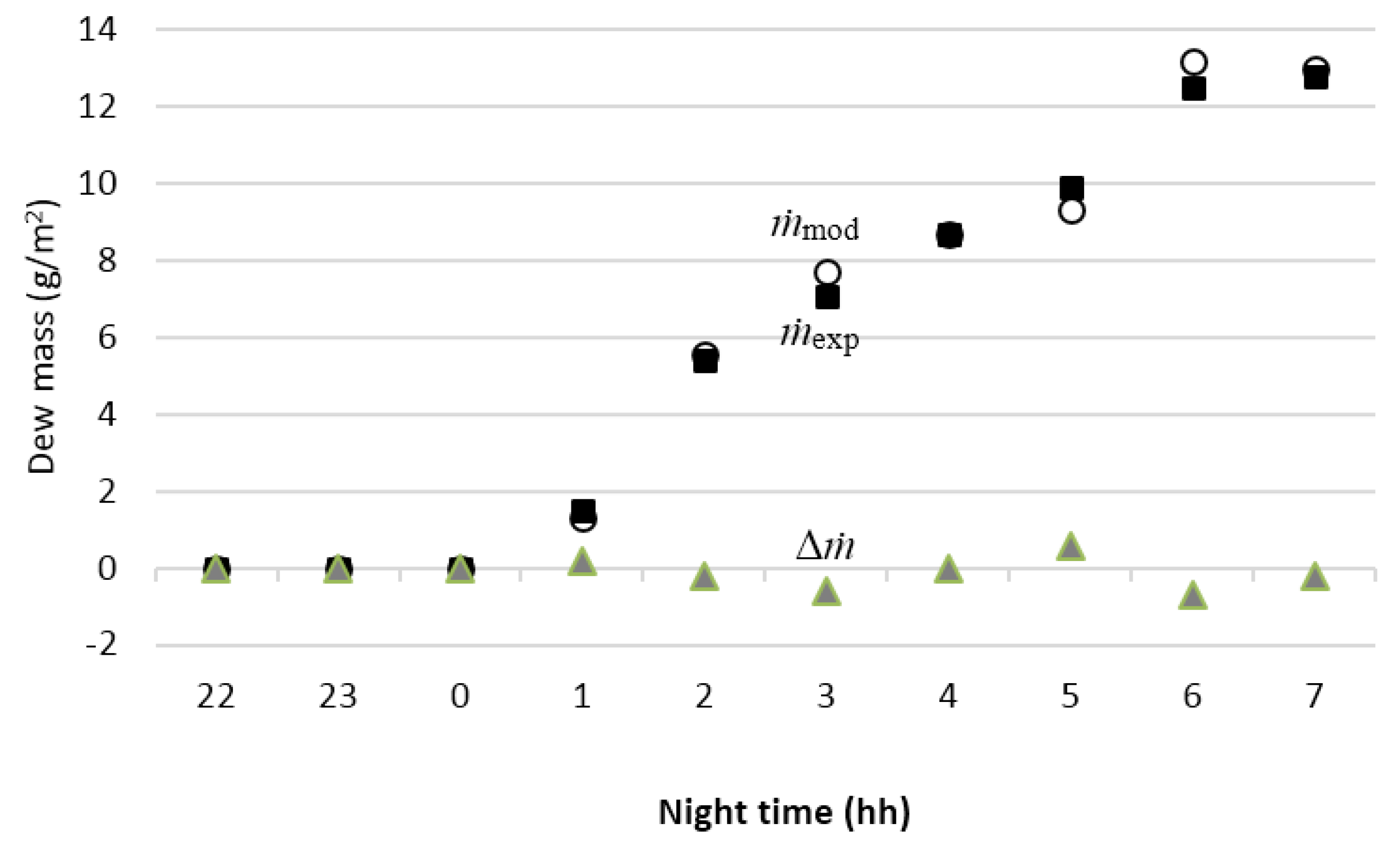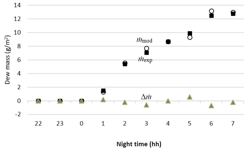 Among the reported mathematical models for the prediction of dew harvest, some are mainly based on steady state energy balances on the radiator-condenser. Nilsson [5] validated their model by collecting 0.145 mm/night in the summer and 0.28 mm/night in autumn in Sweden, and 0.3 mm/night from June to November in Tanzania. However, their theory and experimental results do not match completely. Gandhidasan and Abualhamayel [9] report a dew harvest rate of 0.22 mm/night from January to February in Dhahran, Saudi Arabia, with an agreement of 14.3% between the theoretical and experimental results. On the other hand, Maestre-Valero et al. [18] report 17.4 mm/night and 20.8 mm/night of dew harvest for one year, using white standard foil and black foil, with a Root Mean Square Error (RMSE), of 0.051 mm, and 0.053 mm, respectively. The RMSE represents the sample standard deviation of the differences between predicted values and observed values. The Squared R (R2) were 0.66 and 0.71, respectively, which indicates how well the data fits a model. Vuollekoski et al. [17] reports a theoretical study of potential dew around the world. Because of the general need to determine dew yield in any place of the world, Beysens [19] elaborated a simple analytical formula valid for plane dew collectors. Therefore, most of the validated models report the dew harvest over nocturnal, monthly, or yearly periods, without a better time-step resolution.