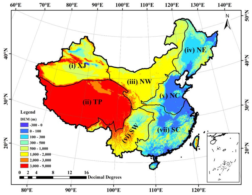 Topographic map of China. The black solid lines indicate the borders of the seven sub-regions: (i) Xinjiang (XJ); (ii) Qinghai-Tibetan plateau (TP); (iii) Northwest (NW); (iv) Northeast (NE); (v) North (NC); (vi) southwest Yungui Plateau (SW); and (vii) South (SC).