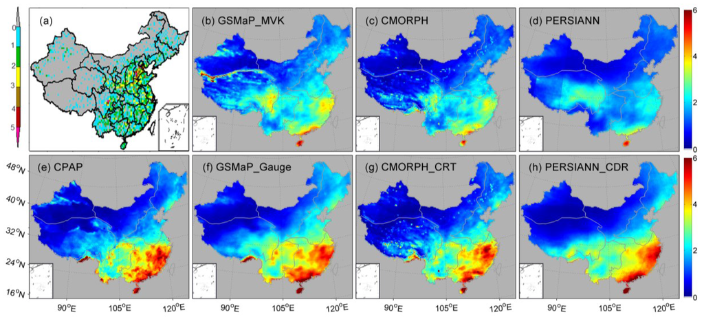The China daily Precipitation Analysis Product (CPAP), which is produced and routinely calibrated by the National Meteorological Information Center (NMIC) and the China Meteorological Administration (CMA), was used as a reference to evaluate the satellite-based precipitation products. Approximately 2400 rain gauge observations are gridded with the climatology-based Optimal Interpolation (OI) technique to yield the 0.25°/daily CPAP. The OI technique shows a higher correlation with individual gauge measurements than other techniques [66], and CPAP exhibits a relative bias of 3.21% at the 0.5° scale when compared to independent gauge observations in the validation [67]. It is important to keep in mind that the gauges used in CPAP may not be completely independent from those used in GSMaP_Gauge, CMORPH_CRT and PERSIANN_CDR. According to the China Meteorological Administration (CMA) [68], approximately 500 of the total gauges (~2400) used in CPAP are also potentially adopted in the GPCP data set which is used in PERSIANN_CDR. In addition, the NOAA Climate Prediction Center (CPC) analysis which includes some GTS gauges from CPAP is used in both GSMaP_Gauge [44] and CMORPH_CRT [69]. Furthermore, it should be noted that both CMORPH_CRT and GSMaP_Gauge are calibrated by daily rain gauge analysis while PERSIANN_CDR is calibrated by monthly rain gauge analysis.