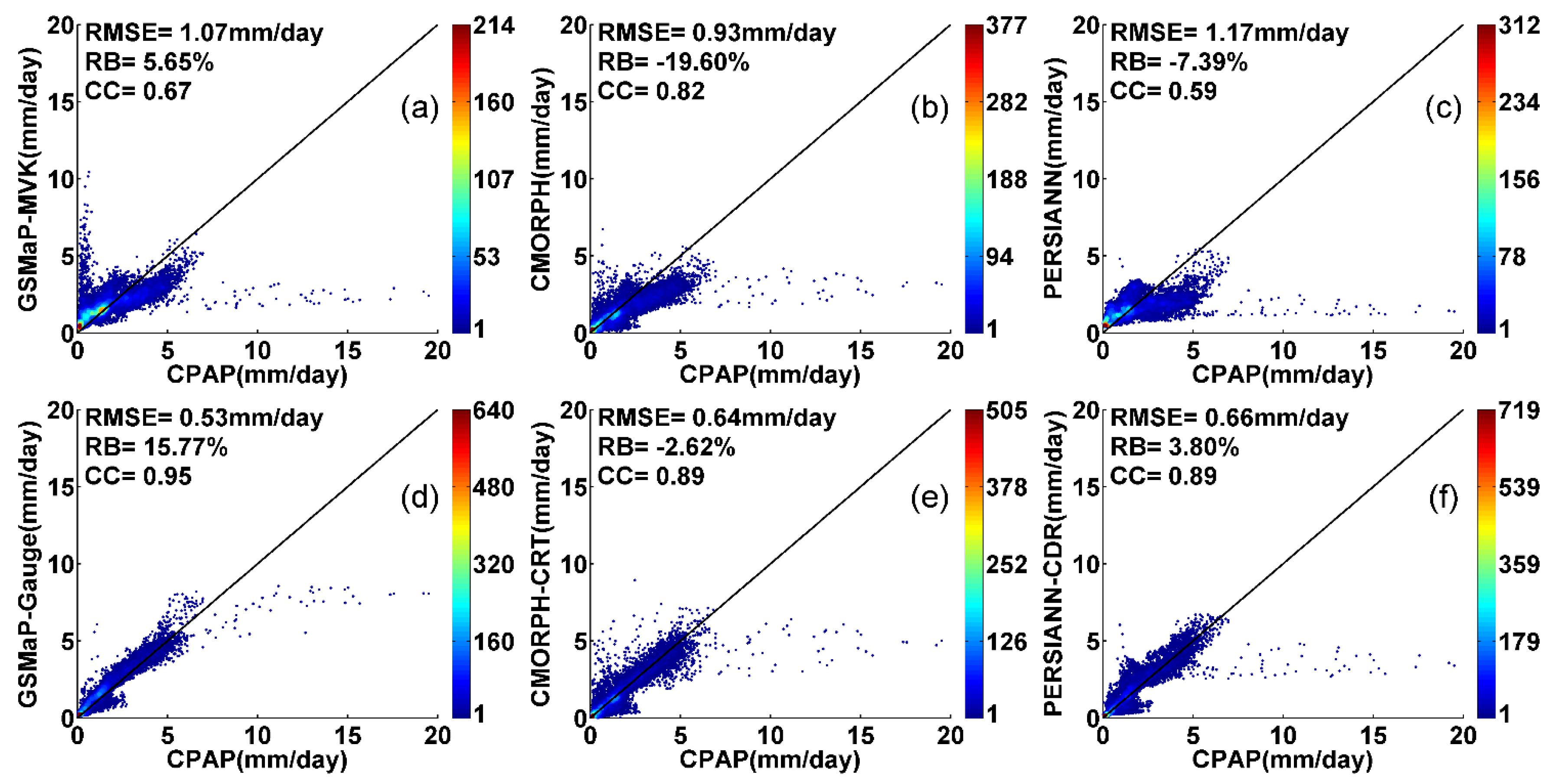 Density-colored scatterplots of various products (a) GSMaP_MVK; (b) CMORPH; (c) PERSIANN; (d) GSMaP_Gauge; (e) CMORPH_CRT and (f) PERSIANN_CDR against CPAP rainfall rate shown in Figure 2. The color represents the occurrence frequency. The dark oblique solid line represents 1:1 line.