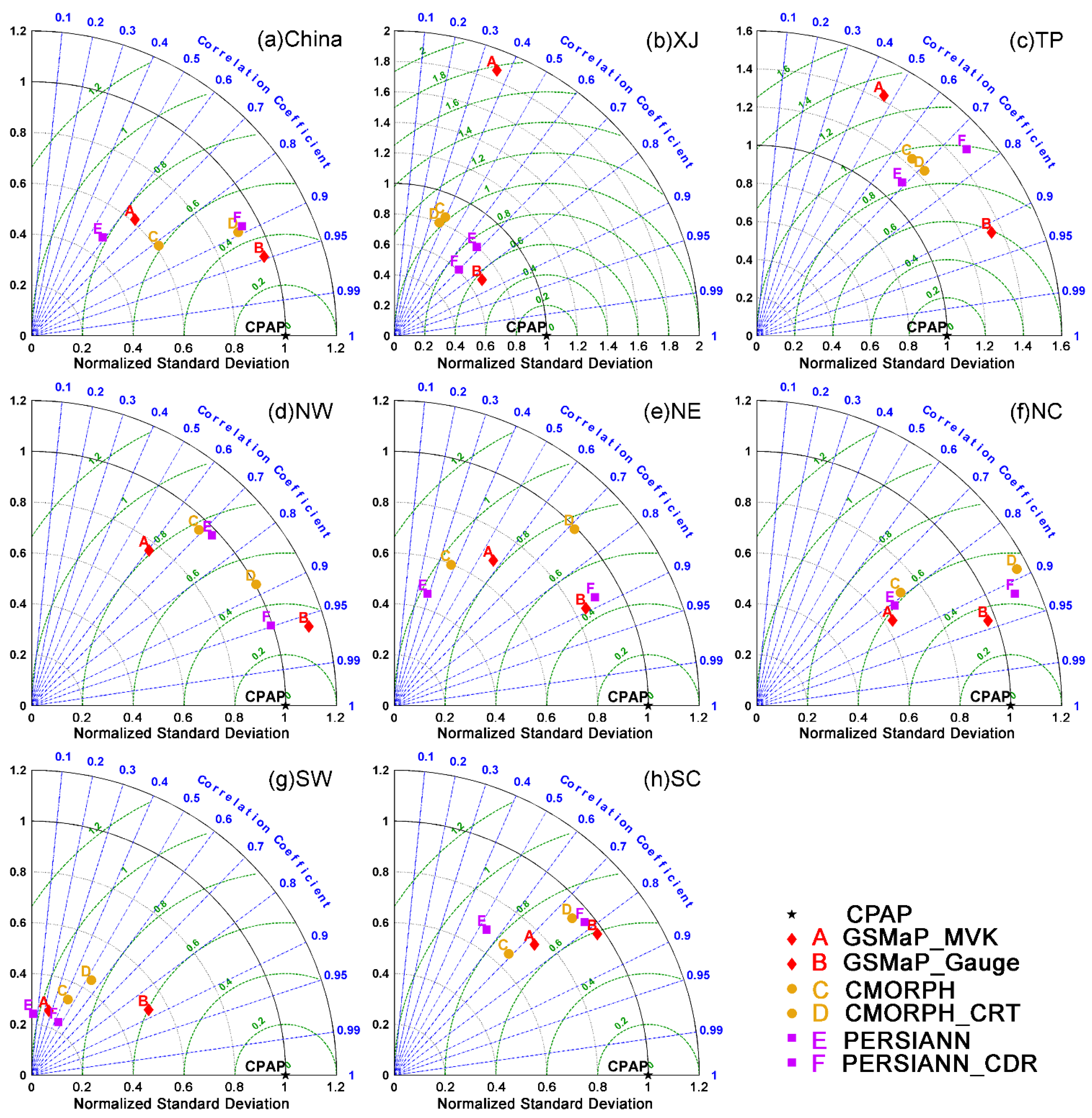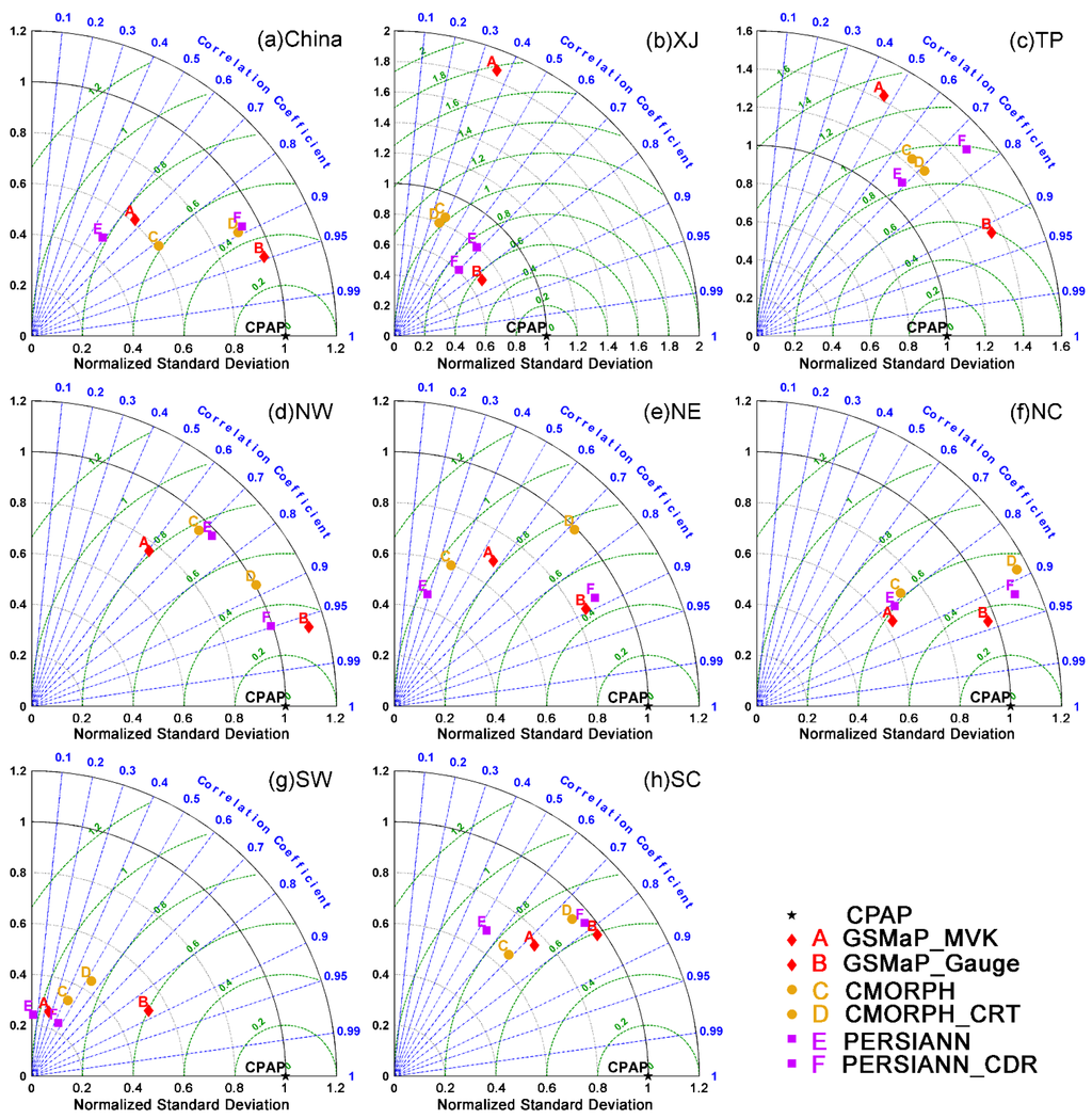 Taylor diagrams showing the correlation coefficients, the normalized standard deviation, and the RMSE of four year daily mean precipitation between six satellite-based precipitation products and the reference data over (a) mainland China and seven sub-regions: (b) XJ; (c) TP; (d) NW; (e) NE; (f) NC; (g) SW; and (h) SC. The radial coordinate is the magnitude of the standard deviation, which is normalized by the standard deviation from CPAP and denoted by black dotted lines. The concentric green semi-circles denote RMSE values. The angular coordinate shows the correlation coefficient (denoted by blue dotted lines). In these Taylor diagrams, the closer the points representing the satellite-based precipitation products are to the CPAP point (marked by the black pentagon), the better the product is with relatively high correlation, low standard deviation and RMSE values. The products from the same algorithm are marked by the same marker with same color and denoted by different characters with the same color. CPAP is marked by a black solid pentagon, while GSMaP_MVK and GSMaP_Gauge are marked by red diamonds and denoted by red A and B, respectively. CMORPH and CMORPH_CRT are marked by orange solid circles and denoted by orange C and D, respectively, whereas PERSIANN and PERSIANN_CDR are marked by purple squares and denoted by purple E and F, respectively.