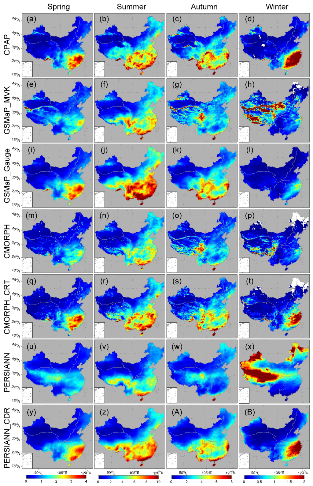 Seasonal four-year daily mean precipitation distribution over China for (a–d) CPAP; (e–h) GSMaP_MVK; (i–l) GSMaP_Gauge; (m–p) CMORPH; (q–t) CMORPH_CRT; (u–x) PERSIANN; and (y–B) PERSIANN_CDR.
