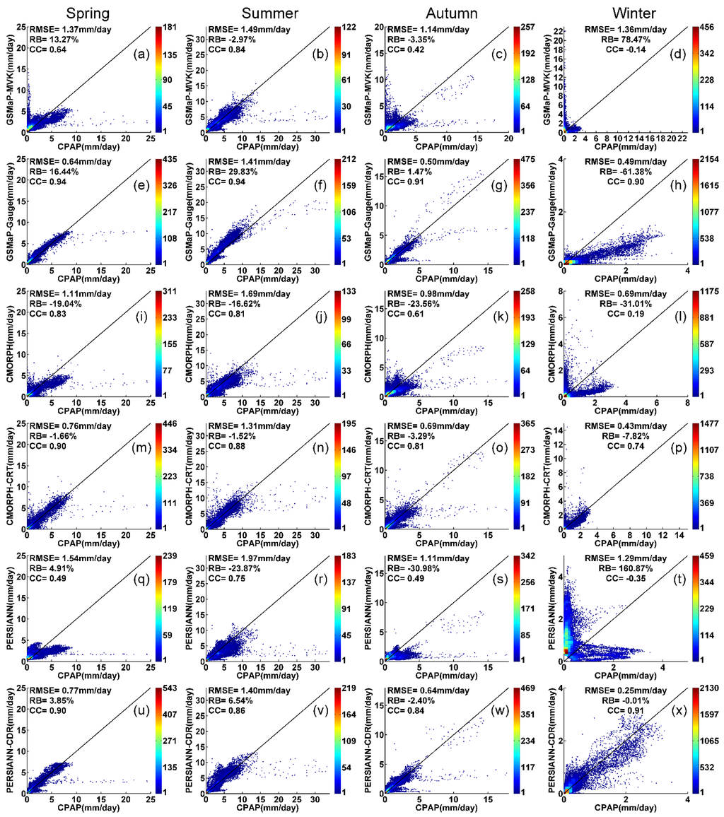 - All the bias-corrected products provide improvements over their corresponding satellite-only counterparts. Among the bias-corrected products, GSMaP_Gauge shows the highest CC (0.90–0.94) but also a relatively high RB (−61.38%–16.44%) and RMSE (0.49–1.41 mm/day) for the seasonal four-year daily mean precipitation (Figure 4 and Figure 5, Table A1). Similar to the other precipitation products, it exhibits the worst performance in winter. PERSIANN_CDR shows the closest performance to CPAP in winter among all satellite-based products.