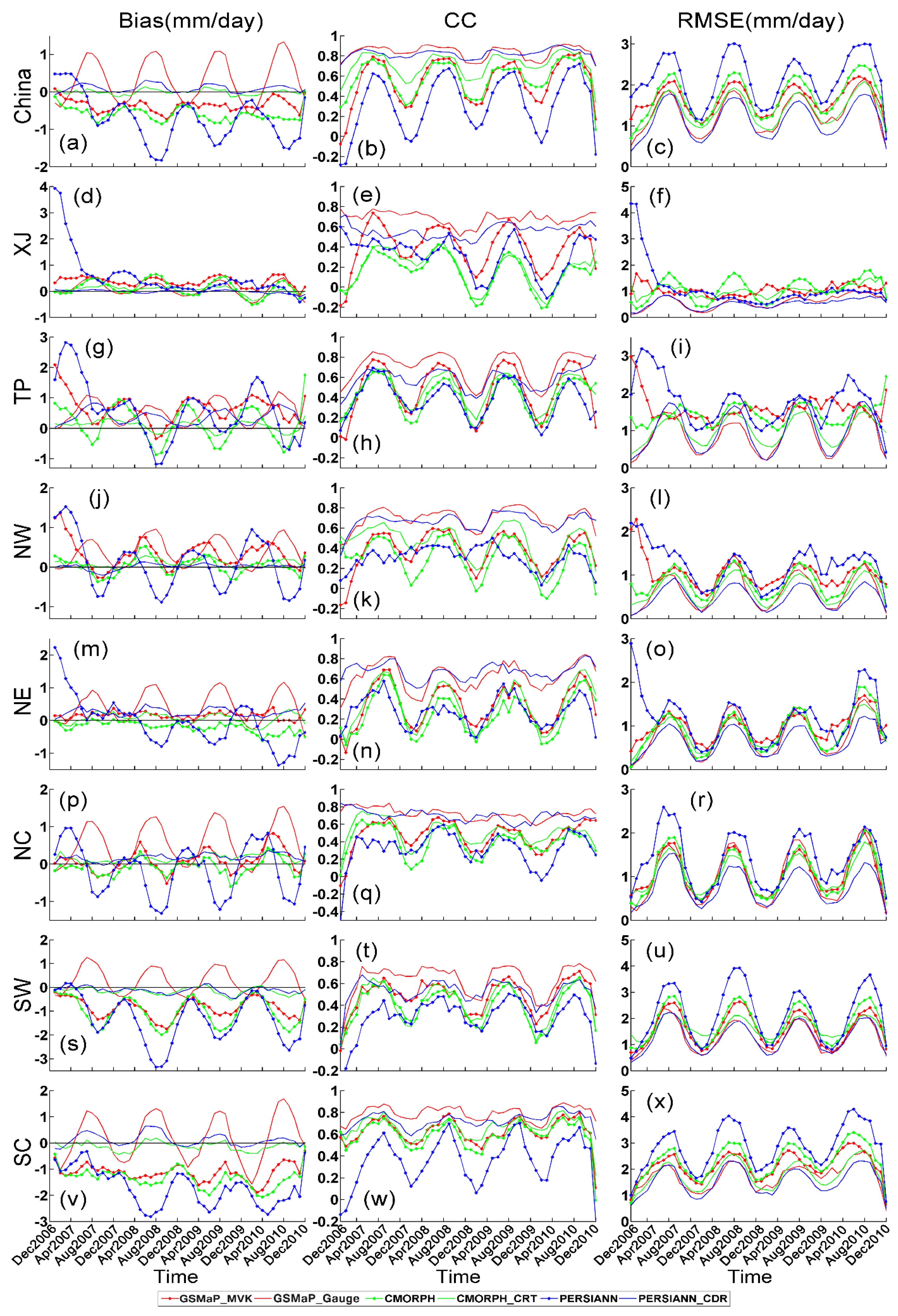 Monthly series of Bias in the left column panels, Correlation Coefficient (CC) in the middle column panels, root-mean-square error (RMSE) in the right column panels between various products and CPAP over (a–c) continuous China and seven sub-regions for (d–f) XJ; (g–i) TP; (j–l) NW; (m–o) NE; (p–r) NC; (s–u) SW; (v–x) SC on 0.25° lat/lon grid box. Only the cells where there is at least one reporting gauge in CPAP and both CPAP and the satellite-based precipitation estimates are above zero have been selected for computation.