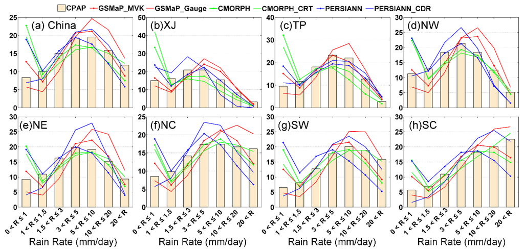 The precipitation rate occurrence distribution of intensities can provide an insight into the characteristics of precipitation rate dependent error and the potential error effect on hydrological applications. Figure 8 shows the Probability distribution functions (PDFs) by precipitation occurrence with different precipitation intensities. The thresholds of precipitation intensity are shown in Table 2. All of the satellite-only precipitation datasets tend to significantly overdetect the occurrence of light precipitation (0 < R ≤ 1 mm/day) over China, especially for the dry climate of western China (i.e., XJ, TP, NW), while tending to underdetect the occurrence of heavy precipitation (more than 20 mm/day) over the wet environment of eastern China (i.e., NE, NC, SW, and SC). This may be related to the fact that the PMW-based algorithms used in the estimates are good at detecting heavy, convective precipitation events, but fail to accurately detect shallow, warm precipitation [87,88]. The substantial evaporation in the dry environments over XJ, TP and NW, as well as the large amount of heavy precipitation over SW and SC, likely are additional contributions to these disparities. In comparison with CMORPH and PERSIANN, GSMaP_MVK shows slightly better performance in detecting light precipitation less than 1 mm/day in all regions and heavy precipitation over 20 mm/day in NE, NC, SW, and SC.