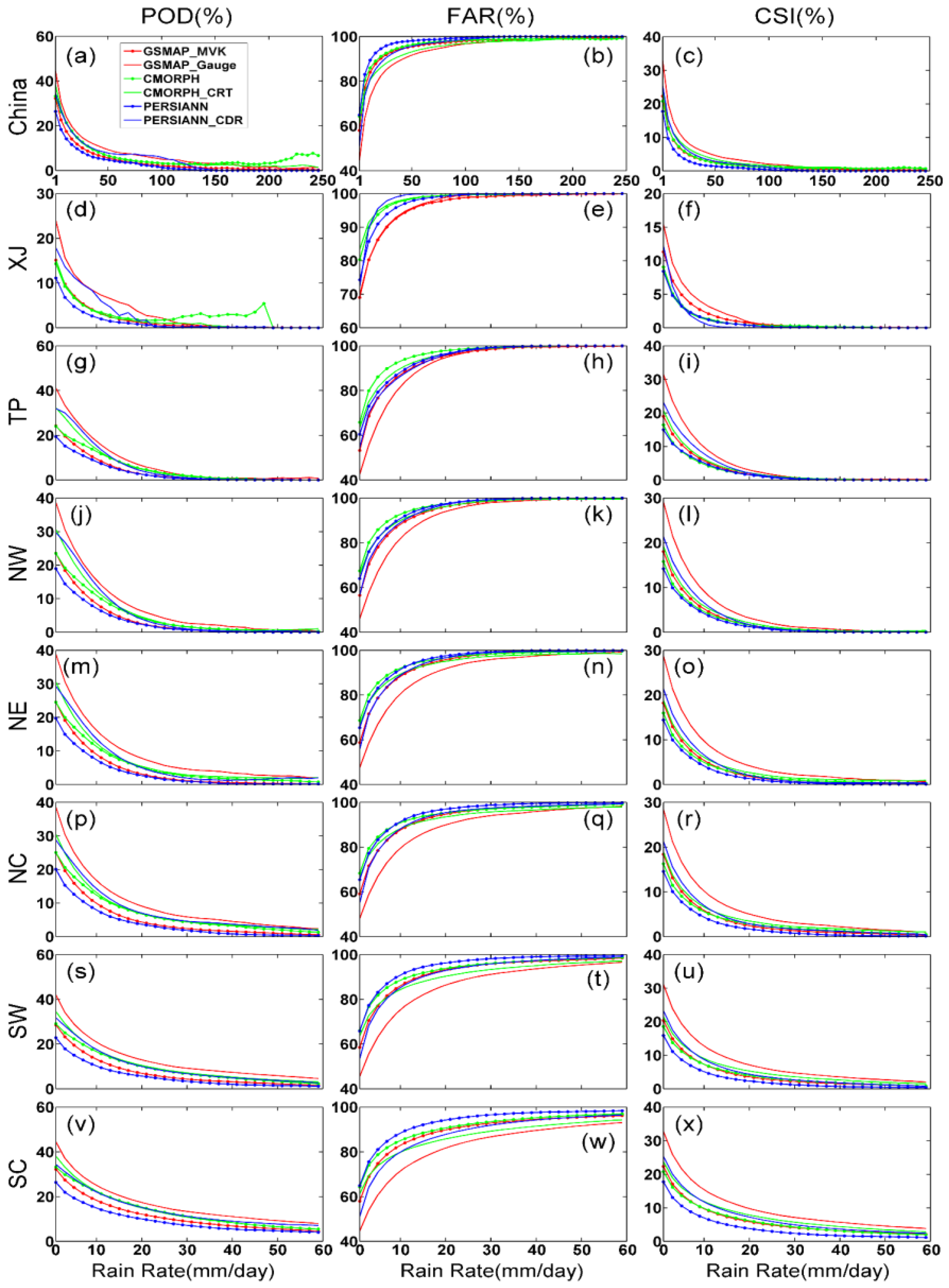 Contingency metrics of POD (left column panels), FAR (middle column panels) and CSI (right column panels) for different products over China and seven sub-regions for (a–c) China; (d–f) XJ; (g–i) TP; (j–l) NW; (m–o) NE; (p–r) NC; (s–u) SW; (v–x) SC, based on 0.25° lat/lon and daily mean precipitation rates (mm/day) day by day. Vertical axis scales were set according to the maximum of y-axis in different subpanels. The calculation of contingency metrics are derived using a 5 mm/day rain rate interval from 1 mm/day to 250 mm/day for mainland China and 2 mm/day interval from 1 mm/day to 60 mm/day for seven sub-regions. Only grid cells where there is at least one reporting gauge and both the reference and the satellite-based precipitation estimates are nonzero can be selected for computing these metrics.