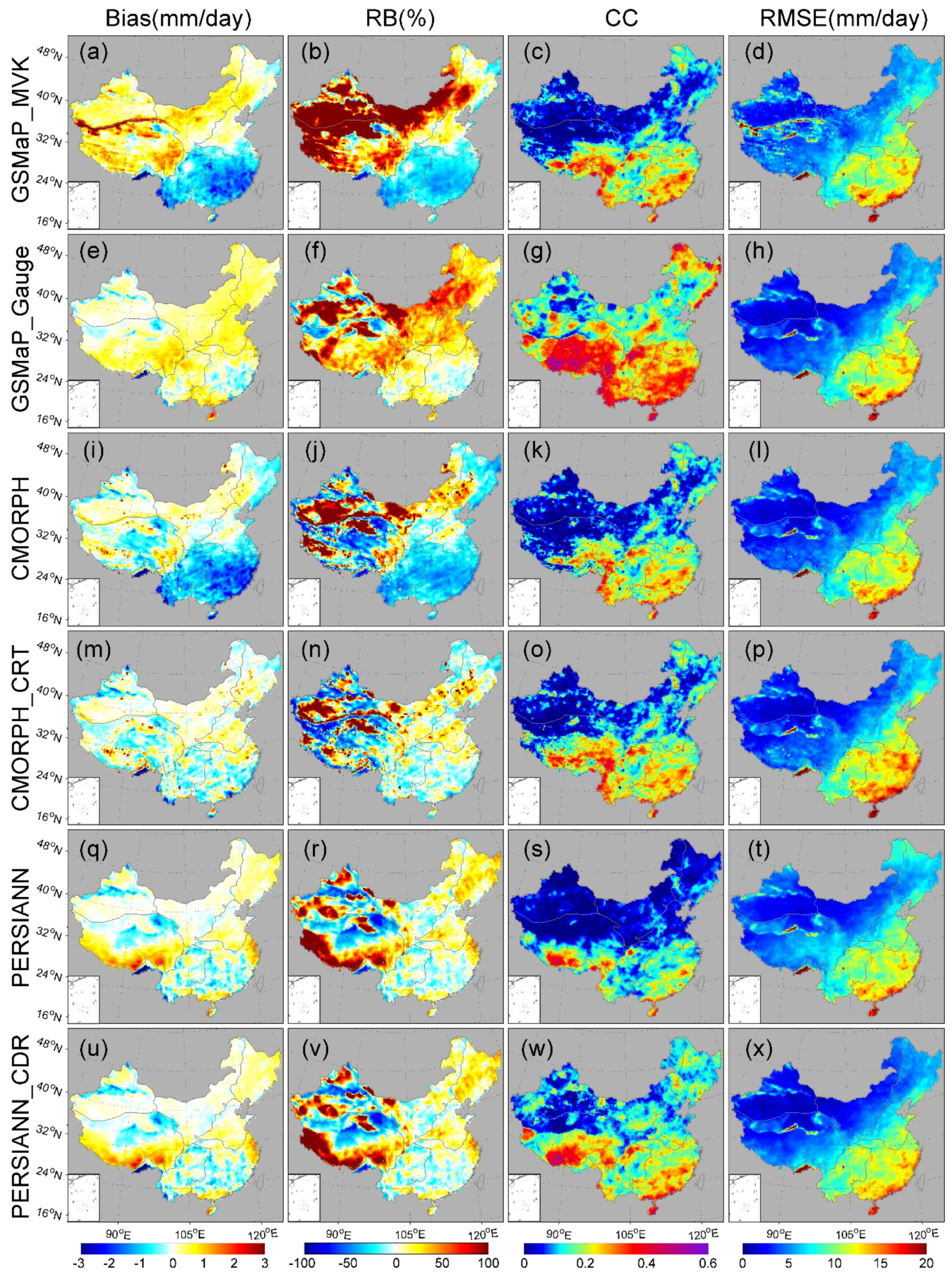 Spatial distribution of Bias, RB, CC, and RMSE between different satellite-based products and CPAP over China on a 0.25° lat/lon grid for (a–d) GSMaP_MVK; (e–h) GSMaP_Gauge; (i–l) CMORPH; (m–p) CMORPH_CRT; (q–t) PERSIANN; and (u–x) PERSIANN_CDR.