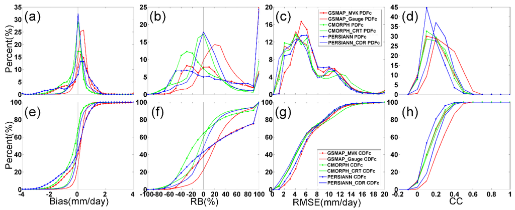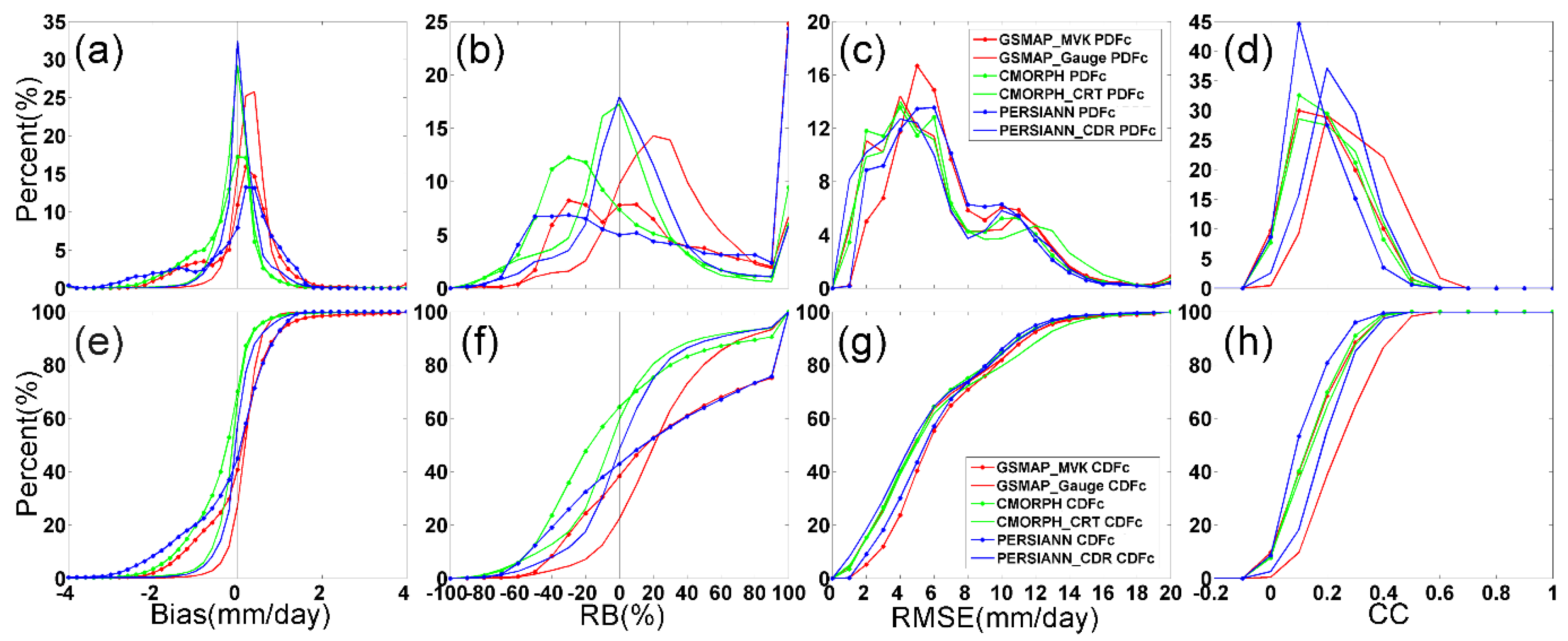 The spatial distribution of the errors associated with satellite-based precipitation products can provide useful information, particularly for analyzing error propagation in regional hydrological and climatological applications. The spatial distribution maps of Bias, RB, RMSE, and CC of the satellite-based products versus CPAP are given in Figure 10. The Bias, RB, RMSE, and CC are computed grid by grid with four-year daily precipitation rates. Figure 11 shows the corresponding Probability Distribution Function (PDFc) and Cumulative Distribution Function (CDFc) of Bias, RB, RMSE, and CC.