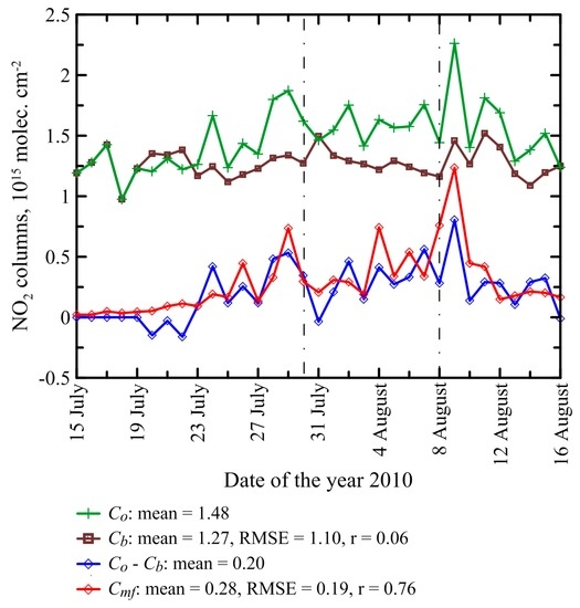 Estimation of the conversion factor (as explained in the previous section) is based on the analysis of daily time series of spatially averaged NO2 columns derived from the OMI measurements (Co) and simulated with the CHIMERE model (Cmf) and involves evaluation of the background fraction (Cb) of the tropospheric NO2 columns. The corresponding time series are presented in Figure 1, along with the time series of the difference of Co and Cb. Examples of underlying daily values of tropospheric NO2 columns (specifically, on 29 July and 8 August) spatially distributed inside of the study region are shown in Figure 2. Note that values of Cmf shown in Figure 1 and Figure 2 were calculated with the conversion factor equal to its reference value αr specified above (see Section 2.1.2). Note also that the spatial distributions of CO and aerosol on the same days were considered in a preceding study [21].