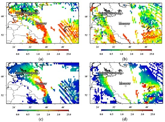(a,b) Spatial distributions of the tropospheric NO2 columns (1015 molec.·cm−2) derived from the OMI measurements on 29 July and 8 August 2010; (c,d) the tropospheric NO2 column amounts originated from wildfires, according to the simulations using the reference value of the FRP-to-BBR conversion factor. Note that the simulation data were processed with the averaging kernels from the OMI retrievals and are, accordingly, shown only where the measurement data were available.