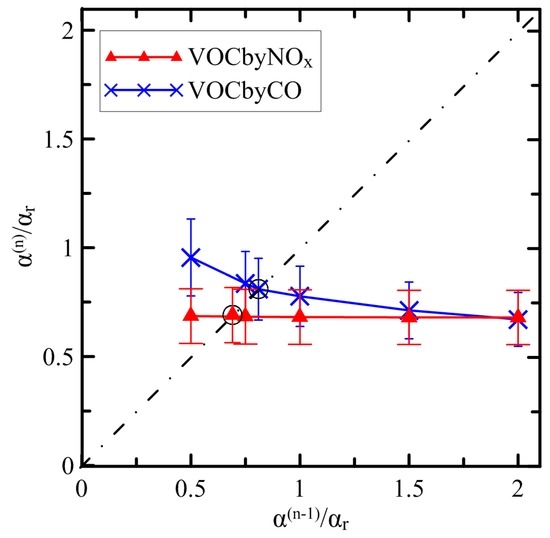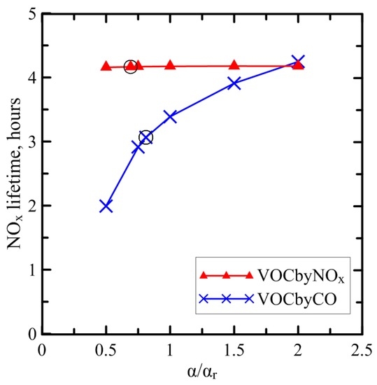 Such an interpretation of the results presented in Figure 6 is consistent with the dependencies presented in Figure 3. Indeed, given that the NOx lifetime is almost independent of α in the “VOCbyNOx”, the results shown in Figure 3 for the same case imply that the NO2/NO ratio and thus O3 concentration are also kept nearly constant. On the other hand, the fact that the relative range of the changes of α(n) in the “VOCbyCO” case in Figure 3 is much smaller than that of the changes of τnox in Figure 6 indicates that the NO2/NO ratio decreases with an increase of α in that case: this observation, in turn, implies that O3 concentration accordingly decreases.
