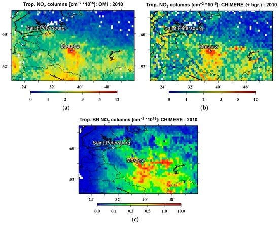 To estimate the background NO2 columns in a given grid cell (i) and in a given day (d), we considered the tropospheric NO2 columns derived from the OMI measurements for the same grid cell but for another day chosen from the period from 15 July to 19 July 2010, when, according to our simulations, a contribution of fires to the mean NO2 columns over the study region was negligible. If such “background” data were available for more than one day, a nearest, to d, day was selected. On the other hand, if there were no observational data for any of the days in the indicated period, then the given grid cell i was excluded from further analysis.