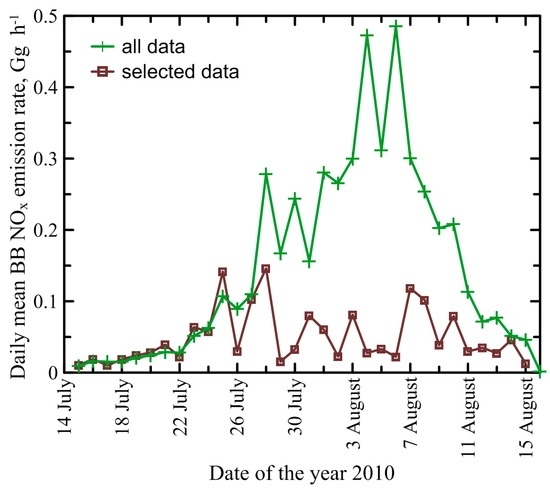 We used our optimal estimate of the FRP-to-BBR conversion factor (0.254 kg·s−1·MW−1) for the VOCbyNOx case to calculate NOx emission rates from wildfires in the study region and period. Figure 7 shows the time series of the daily BB NOx emission rates that were obtained by integrating either over all grid cells and hours of a given day or only over selected grid cells/hours that were provided with the OMI NO2 data. According to our calculations, the “full” emissions tended to increase until 6 August and then started to decrease, consistently with results of other studies [9,19,21,49] that reported on the strong air pollution in the study region in the beginning of August. Two major peaks of the BB NOx emission rate occurred on 4 August and 6 August. A difference between the two time series indicates to what extent the information provided by the OMI retrievals on BB NOx emissions is representative of the whole study period. Evidently, the BB NOx emission rates corresponding to the scenes provided with the OMI NO2 retrievals represent only a part (around 30%, on the average) of the integral emission rates in the study region and period. Therefore, there is a question whether or not our optimal estimate of the FRP-to-BBR conversion factor is representative (at least, on average) of all fires in the study region.