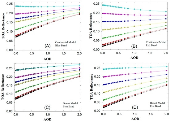The 6S (Second Simulation of the Satellite Signal in the Solar Spectrum) basic radiative transfer model is used to simulate satellite observations that consider elevated targets, molecular and aerosol scattering and gaseous absorption (including H2O, O3, CO2, etc.) [21]. Figure 2 shows the simulation results of the sensitivity of the apparent reflectance and AOD under different conditions: (1) the spectral parameters are the MODIS blue and red bands; (2) the geometric parameters are ; (3) The surface reflectance range of the red and blue bands is 0.001–0.20, and this range includes most typical land features, excluding ice and snow; and (4) the 6S model defines the commonly used aerosol models, including urban/industrial, continental, desert, and biomass-burning aerosol models. These parameters were chosen to simulate the sensitivity of the AOD, and the results are shown in Figure 2.