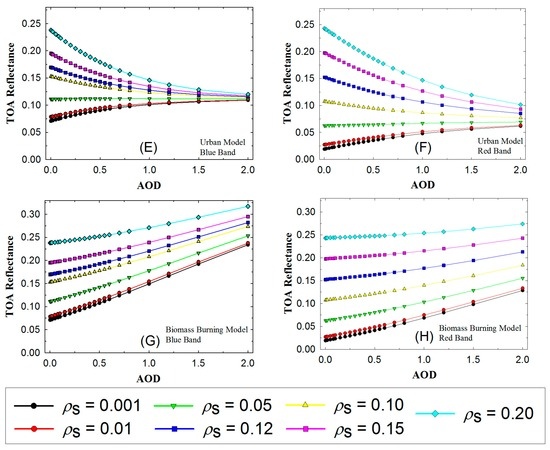 Apparent reflectance as a function of aerosol optical depth (AOD). (A) Continental Model Blue Band; (B) Continental Model Red Band; (C) Desert Model Blue Band; (D) Desert Model Red Band; (E) Urban Model Blue Band; (F) Urban Model Red Band; (G) Biomass Burning Model Blue Band; (H) Biomass Burning Model Blue Band.