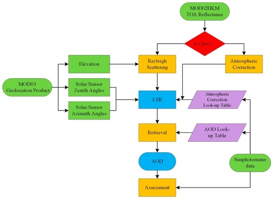 This paper utilizes high-temporal resolution MODIS data. Based on the atmospheric parameters from ground–measured data, after selecting a clear image from the MODIS images, the surface reflectance can be obtained using the atmospheric corrections described above. Then, the aerosol optical parameters (the single scattering albedo is 0.827, and the asymmetry factor is 0.910) in the study area are retrieved using sun photometric data, and the 6S model is used to construct a Look-Up table (LUT). To eliminate the influence of Rayleigh scattering on atmospheric molecules, a digital elevation model (DEM) based on the MODIS geolocation product data (MOD03) was used to estimate the height (z) and calculate for each pixel. A Rayleigh correction was applied only to land pixels, and water pixels were masked based on the land mask data from the MOD03 product. The flow chart in Figure 3 shows the procedure for retrieving AOD from MODIS data.