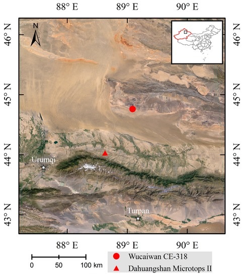 The autonomous territory of Xinjiang province is located in the hinterland of the Eurasian continent, far from the ocean, and it is dominated by a typical continental arid climate. Because it has low precipitation, sparse vegetation, poor soil, and fragile ecosystems, this region is highly sensitive to various natural and human activities. Based on the site distribution, several local areas in Xinjiang (42.7°N–46.3°N, 87.2°E–90.7°E) were selected for this study, including the Gurbantunggut Desert in the Junggar Basin hinterland and portions of the Tianshan Mountains. These areas have low vegetation coverage and few surface feature variations because the land is mainly desert (similar to the Gobi Desert).