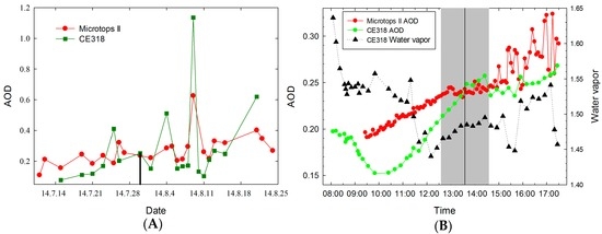 Atmospheric parameters measured using the CE318 and Microtops II sun photometers. The (A) plot shows the AOD calculation results at 550 nm, and the black line is the day with the smallest measured difference (30 July). The (B) plot shows the atmospheric parameters (including AOD at 500 nm and water vapor from CE318) on 30 July the black line shows the imaging time of the MODIS data (13:35), and the grey shaded area is the 30 min before and after the overpass).