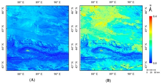 The global aerosol data provided by MOD04 products achieve a certain level of accuracy. Most validation studies have concluded that, in general, the MODIS algorithm used to retrieve aerosol products provides results comparable to sun photometer-based products and that an expected error envelope could be defined that contained at least a 67% (approximately one standard deviation) agreement over vegetated areas [16]. The MODIS algorithm has been widely applied for climate modeling, air quality testing, etc. [36]; however, a similar result was found in northern desert areas, with the ratio of MODIS to observations ranging from 15% to 55%. Approximately 7% to 39% of MODIS products fall within NASA’s EE range, and most of the inversion results are higher than the ground-measured values [37]. Figure 11 shows the distribution of comparable MODIS MOD04 products during the study campaign, illustrating that this product was suitable only for areas covered by dense vegetation in Tianshan, and it had a substantially altered spatial distribution and lower resolution (10 km). Figure 12 shows that the scatter plots of the AOD retrieved using the proposed method are validated by the ground-based sun photometer AOD measurements. In Figure 12, the black dashed lines represent NASA’s EE lines, the black solid lines are the 1:1 lines, and the red solid lines represent the regression lines. Figure 12A,B show the results retrieved using our proposed algorithm and the MOD04 AOD results, which have R2 values of 0.84 and 0.10, respectively. The AOD results obtained using the new algorithm better fit the ground-measured values, with more points lying within NASA’s EE range.
