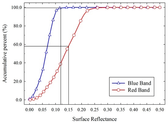 Based on the ground measurement data (shown in Figure 5), the AODs measured by the CE318 and Microtops II sun photometers were closest on 30 July 2014, with an absolute difference of 0.0146. The imaging time of the MODIS sensor on this date was 13:35 within one hour before and after imaging, and the maximum and minimum absolute deviations of the AOD values at 500 nm obtained from the two instruments were 0.0234 and 0.0011, respectively. The average water vapor measured by CE318 during this time period was 1.4804 cm. No cloud cover occurred over the study area during this time. Thus, the atmospheric conditions were relatively stable over the study area. Therefore, we selected the 30 July 2014, MODIS image as a clear reference image from the long-term series of MODIS data. Using the measured atmospheric parameters (AOD = 0.2435 and water vapor = 1.4804 cm), atmospheric correction was conducted using the radiative transfer model to obtain the surface reflectance of the red and blue bands. The results are shown in Figure 6. The surface reflectance in the blue band was generally smaller than that in the red band. The local desert area and the ice-covered area on top of the Tianshan Mountains had reflectance values greater than 0.2. Figure 7 shows a cumulative percent distribution diagram of the surface reflectance according to the atmospheric correction results, the blue and red lines represent the surface reflectance distribution of blue and red bands, respectively. As shown in Figure 7, approximately 99% of the surface reflectance values were below 0.12 in the blue band, and almost 58% of the surface reflectance values were below 0.15 in the red band. As illustrated in Figure 2, when the surface reflectance in the blue and red bands is less than 0.12 or 0.15, respectively, changes in AOD can still cause changes in apparent reflectance. In addition, to minimize the error, the surface reflectance values of the blue and red bands were limited to less than 0.12 and 0.15, respectively.