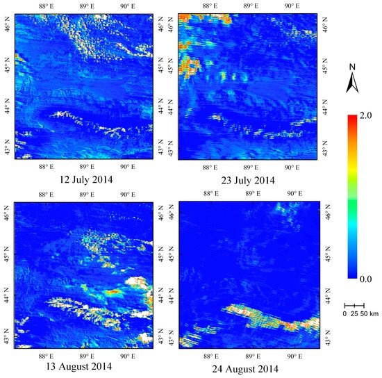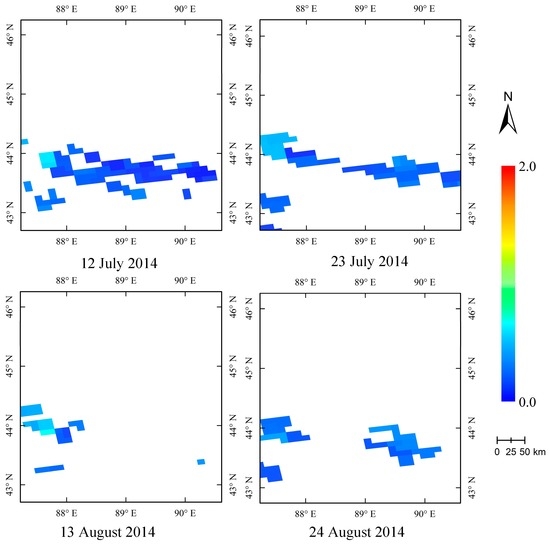 During the study period, the MODIS reflectance data covering the study area at a 500 m resolution (MOD02HKM) in July and August 2014 were selected using ground-based remote sensing measurements. In accordance with the selected MODIS data, inversion experiments were performed based on the obtained surface reflectance data. Figure 8 shows the spatial distribution of AOD over the study area retrieved from MODIS images at a 500 m resolution. These results demonstrate that the new algorithm can achieve a continuous AOD distribution, even in desert areas with high reflectance. The new algorithm describes the aerosol distribution and variability in detail and at a higher spatial resolution (500 m) than the current operational MODIS AOD product (MOD04) (10 or 3 km). As shown in Figure 8, although the retrieved overall AOD value is small, some large values appear at the edges of the clouds. The white areas in the map indicate that no data were retrieved in these areas, generally because they were covered by clouds or snow.