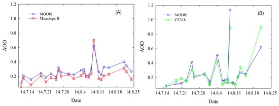 Because the solar spectrometer lacked a 550 nm channel, we chose the two channels closest to 550 nm and then calculated the AOD at 550 nm using Equation (6). Based on the available channels for the CE318 and Microtops II sun photometers, and the influence of water vapor on the radiative transfer [30]. As a result of previous studies [31,32,33,34], we selected the 500 nm and 670 nm channels and 500 nm and 870 nm channels, respectively.