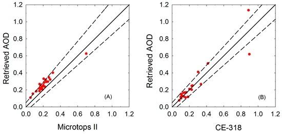 To decrease the influences of atmospheric instability, such as pixel pollution due to the presence of thin clouds, ragged clouds, and cloud edges, the average inversion results for a 3 × 3 pixel area were selected as the final verification result. Forty-five pairs of valid data were obtained at the Dahuangshan and Wucaiwan sites. Figure 9 shows a comparison of the time series between the measured AODs and the retrieved results. The overall trends of these results exhibited good agreement, although the retrieved values were slightly smaller than the measured values. Figure 9A shows the Microtops II results at the Dahuangshan site. The maximum absolute difference between the inversion values was 0.12. Figure 9B shows the results of the CE318 at the Wucaiwan site, where the maximum absolute difference was 0.27. The largest differences occurred on 9 August, and the measured value was largest on that day. Based on the true color composite image, this error may be due to the impacts of clouds.