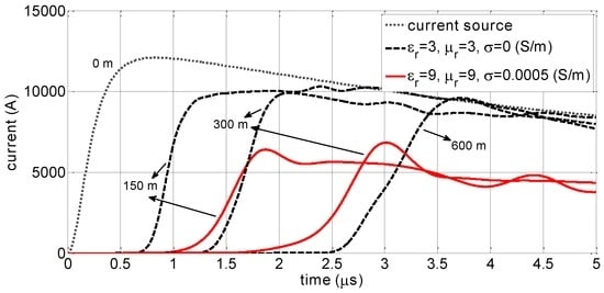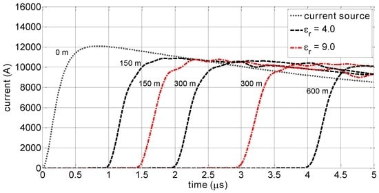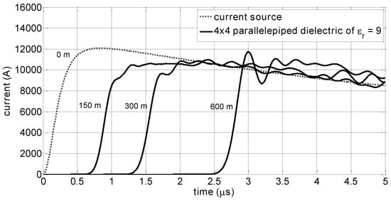 Figure 3 shows the CST-MWS-calculated current distribution along the return-stroke channel embedded in a 4 × 4 m2 parallelepiped dielectric of εr = 9.0 and μr = 1.0. As it can be seen, the presence of the dielectric coating resulted in the reduction of the current wave propagation speed along the channel down to about 0.71c. At the same time, as can be clearly seen in Figure 3, the parallelepiped coating leads to wave reflections at its boundaries with the surrounding air, which results in fluctuations riding on the current wave along the channel. These fluctuations become more and more significant as the wave propagates up the channel.