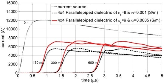 To attenuate the fluctuations, we have added a small conductivity to the coating. The results can be seen in Figure 4, which shows the current distribution along the lightning channel for a 4 × 4 m2 parallelepiped dielectric of εr = 9, μr = 1, σ = 0.001 S/m and σ = 0.0005 S/m. It should be noted, however, that the losses introduced by the finite conductivity also attenuate the current peak values significantly.