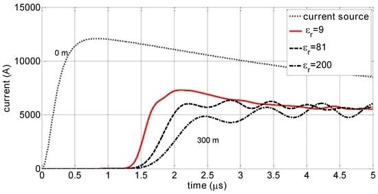 Current distribution along the lightning channel at height 300 m calculated by CST-MWS for a 4 × 4 m2 parallelepiped dielectric of εr = 9, εr = 81, and εr = 200 for σ = 0.0005 S/m. Model B1: Wire embedded in a fictitious dielectric coating.