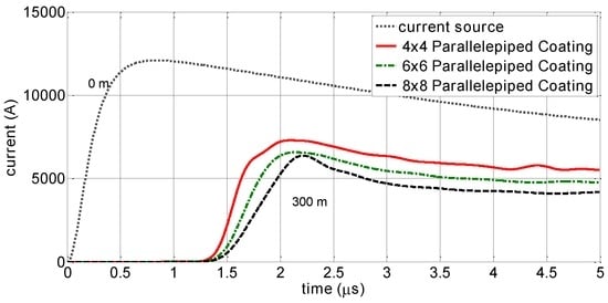 It is also important to note that the size of the parallelepiped coating will also affect the current distribution along the channel as well as the resulting propagation speed. This is illustrated by the simulations presented in Figure 6, where the current waveforms at the channel base and at a height of 300 m are evaluated varying the size of the coating (4 × 4, 6 × 6 and 8 × 8 m2). As expected, it can be seen that increasing the size of the coating will result in higher dispersion of the current as well as a slower propagation speed.