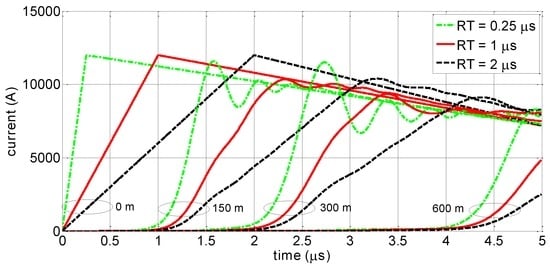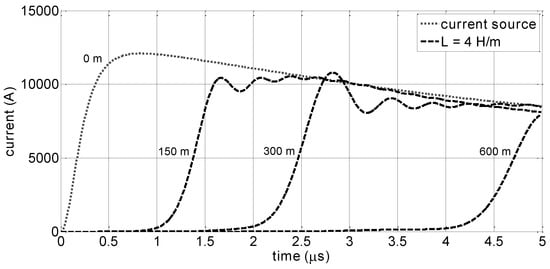 The effect of the value of the series inductance on the current distribution along the lightning channel is illustrated in Figure 9. The height-dependent resistance is the same as in Figure 8. It can be seen that the speed of the current pulse can be controlled easily by changing the value of the distributed series inductance. For the considered cases of L = 2, 4 and 8 μH/m, the values for the speed of the current wave along the channel are about 0.62c, 0.45c, and 0.38c, respectively.