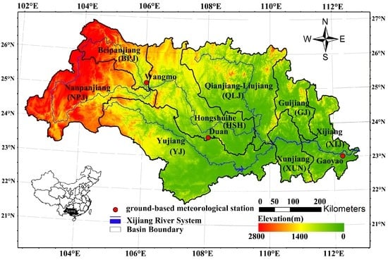 The Xijiang Basin is located at 21.31 N–26.49 N and 102.14 E–112.88 E, and covers an area of 406,000 km (Figure 1). The region contains the major tributary of the Pearl River, which originates in the Maxiong Mountains of Yunnan Province, southwest China, and flows through the Guizhou, Guangxi, and Guangdong Provinces, before entering the South China Sea through the Pearl River Delta. Elevation in the basin decreases from the northwest (the Yunnan–Guizhou Plateau) to the southeast delta area. The runoff generation mechanism and concentration time under such complex topography are still under investigation. What is more, the complex topography makes it difficult to gather adequate precipitation information, which is essential to flood forecasts. These factors make it challenging to forecast flood events prior to the periods of runoff concentration.
