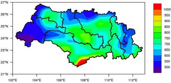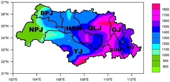 The region is characterized by a subtropical-to-tropical monsoon climate [18]. Mean annual rainfall over the last three decades varied between 900 and 2200 mm (Figure 2). The Beipanjiang (BPJ) and Nanpanjiang (NPJ) sub-basins are situated to the west, where the annual precipitation is between 900 and 1300 mm. The annual precipitation of the Hongshuihe (HSH) and Yujiang (YJ) Basins are relatively higher than those of BPJ and NPJ, but lower than the others, which include Qianjiang–Liujiang (QLJ), Guijiang (GJ), Xunjiang (XUN), and Xijiang (XIJ). The flooding season extends from April to September, during which nearly 72%–88% of the annual runoff is formed. The area of each sub-basin is shown in Table 1.