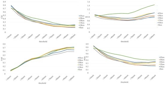 When the bias and FAR are taken into consideration, higher horizontal resolution always resulted in higher bias and FAR scores. When the threshold was greater than 60 mm/day, the bias increased significantly at a horizontal resolution of 5 km. The biases of 15 km and 10 km were almost the same, which were close to the value of 1 when the threshold was greater than 100 mm/day. Although the FAR scores at a horizontal resolution of 10 km were higher than that of 20 km, it was much lower than other resolutions.