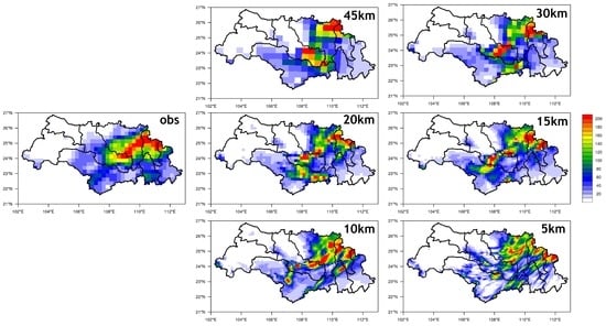 Differences still exist, especially for the simulation of rainstorm centers. Here, we selected Case 5 as a typical case because the amount of areal average precipitation and maximum grid precipitation was greatest when compared with other cases. It was obvious that the main rain belt which covered southern GJ and the center of the HSH sub-basin was well captured by all horizontal resolutions (Figure 5). However, the location of rainstorm center showed great diversity with different resolutions. When the horizontal resolution was below 15 km, the rainstorm center located in the center of the QLJ sub-basin was not well captured. The amount of simulated precipitation was about 140 mm/day, while the observed precipitation exceeded 200 mm/day. Although the distribution at a horizontal resolution of 10 km and 5 km was much closer than observation, the discontinuity of rain bands at a horizontal resolution of 5 km made it more difficult to locate the real rainstorm center.