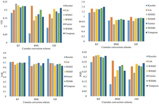 Mean CSI, B, FAR, and POD scores for seven case studies at different physical parameterization schemes (threshold ≥ 100 mm/day). (KF: Kain–Fritsch; BMJ: Betts–Miller–Janjic; GD: Grell–Devenyi; WSM: WRF–Single–Moment.)